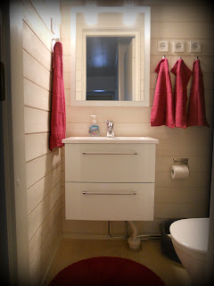 Iltapäivällä poikettiin pojan kanssa hätäiseen Prismassa ja kun tulimme kotiin, siivosin molemmat vessat. Pikkuvessamme sai vielä uudet tekstiilit. Kun en löytänyt keltaista, piti tyytyä marjapuuron punaiseen. (Kauniimpi luonnossa kuin kuvissa) Vaihtelua tämäkin.